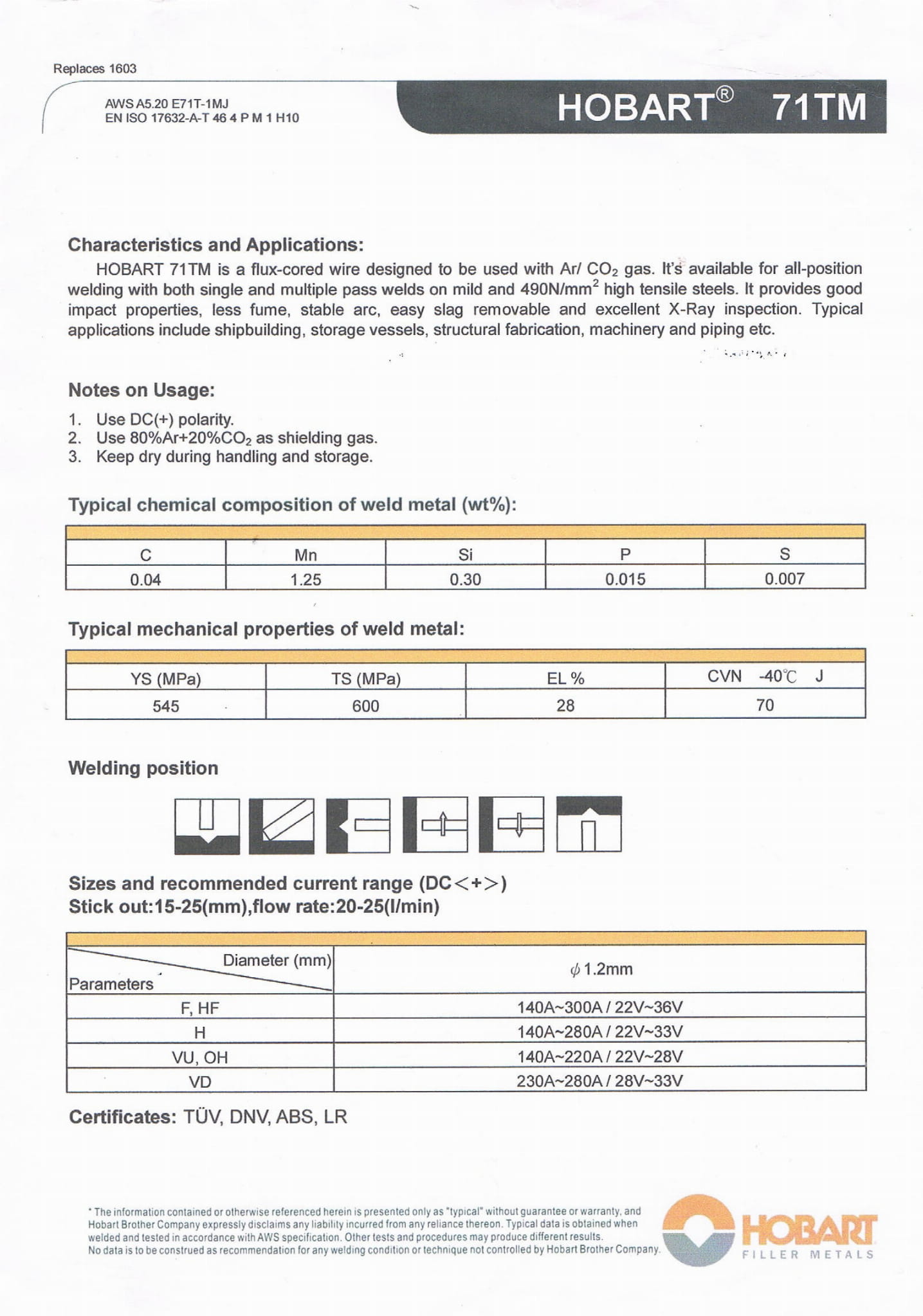 Jest przystosowany do spawania we wszystkich pozycjach, zarówno z pojedynczym, jak i wielościegowym spawaniem stali miękkiej i stali o wysokiej wytrzymałości na rozciąganie 490 N/mm2. Zapewnia dobre właściwości udarowe, mniej oparów, stabilny łuk, łatwo usuwalny żużel i doskonałą kontrolę rentgenowską.