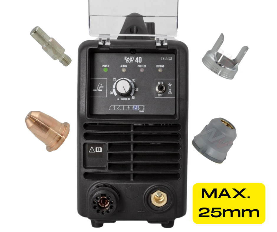 SPARTUS EasyCUT40 to niewielkich rozmiarów przecinarka plazmowa. Przeznaczona do cięcia materiałów przewodzących prąd elektryczny. Zasilana jest z sieci jednofazowej 230V. Dzięki wykorzystaniu nowoczesnych technologii, udało się uzyskać lekkie i niewielkie źródło o mocy 40A, którego maksymalna grubość cięcia wynosi 25 mm.