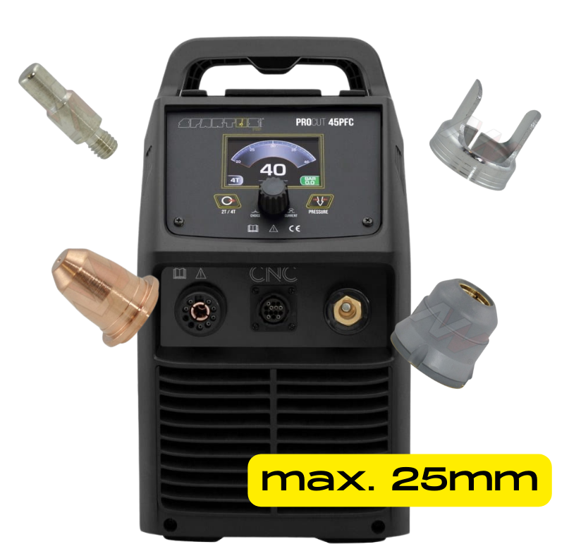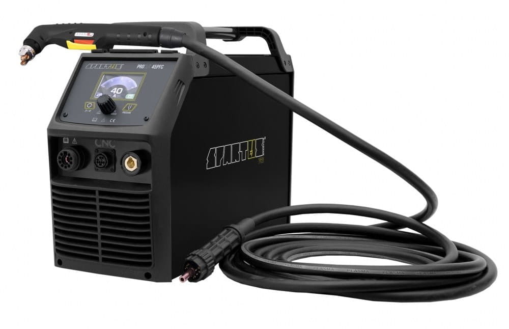 Popularna przecinarka plazmowa Spartus ProCut 45PFC z oddzieleniem do 25 mm. Tnie wszystkie materiały przewodzące prąd. W zestawie z ręcznym uchwytem plazmowym SP45H o długości 6 metrów i częściami zamiennymi.